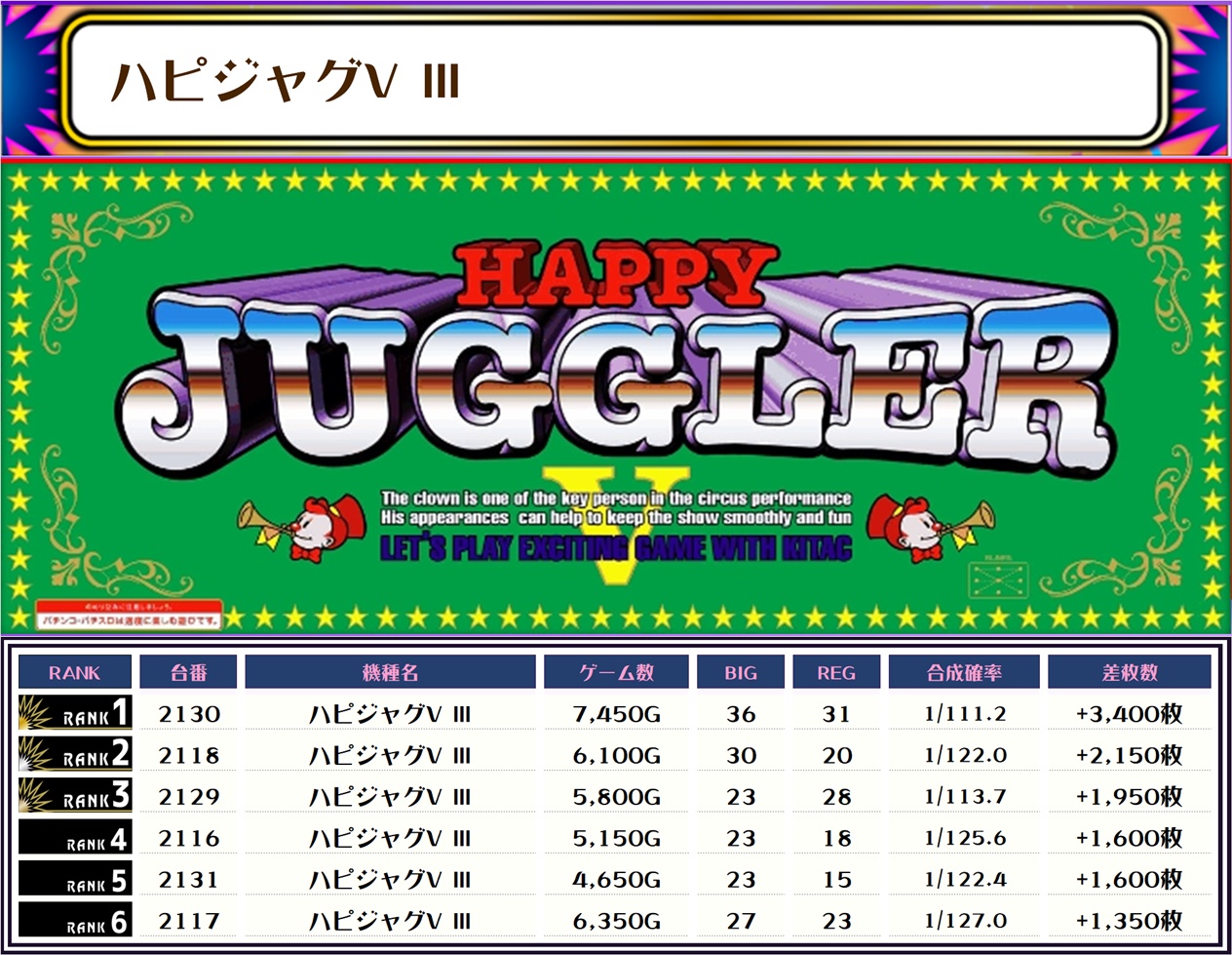 店舗の看板機種でもあるジャグラー系がかなり盛り上がっていましたね✨✨✨ その中でも僕が気になったのはハピジャグV Ⅲ🤡 全台差枚数がプラスで、高稼働となっていました🔥🔥