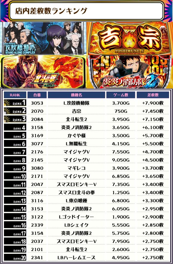 2位には【吉宗・2070番台】の+7,450枚、3位には【北斗転生2・2084番台】の+7,150枚がランクインっ🏆🏆🏆
