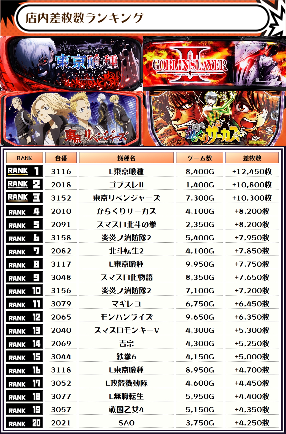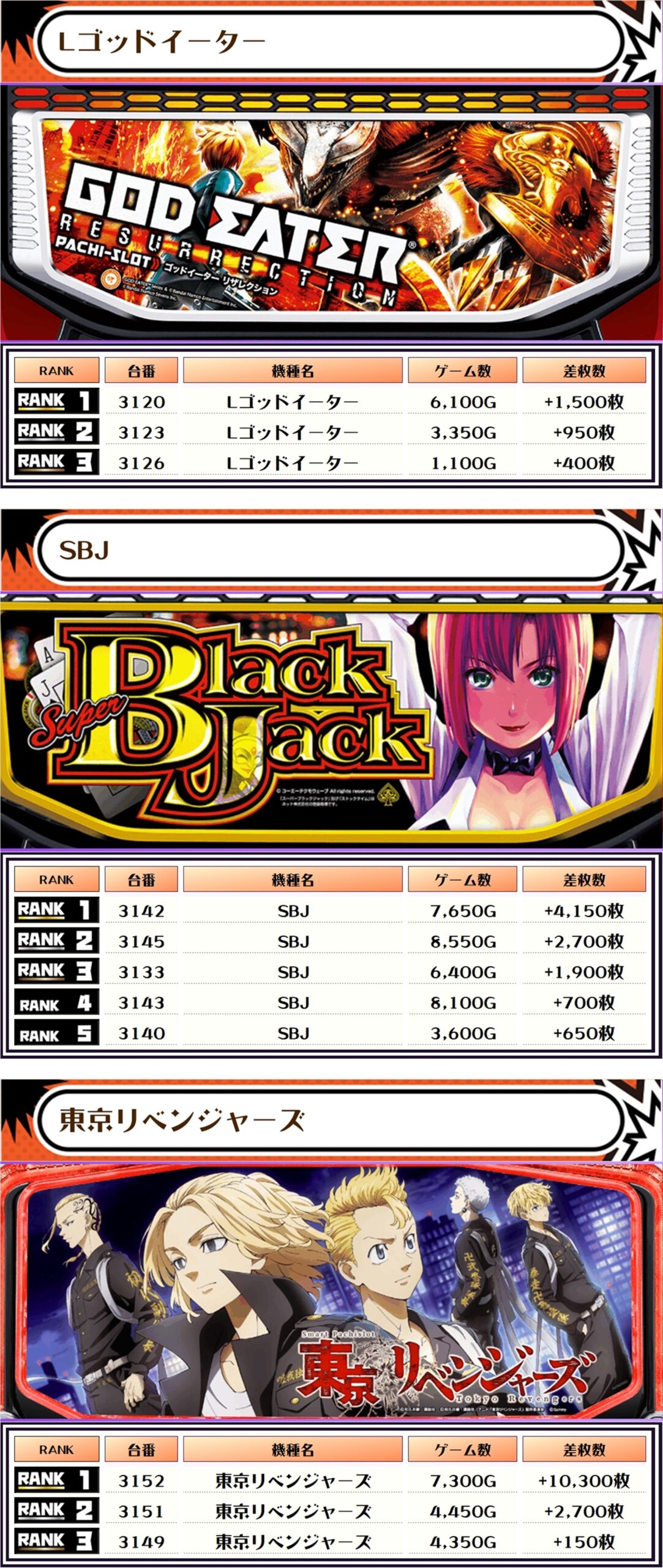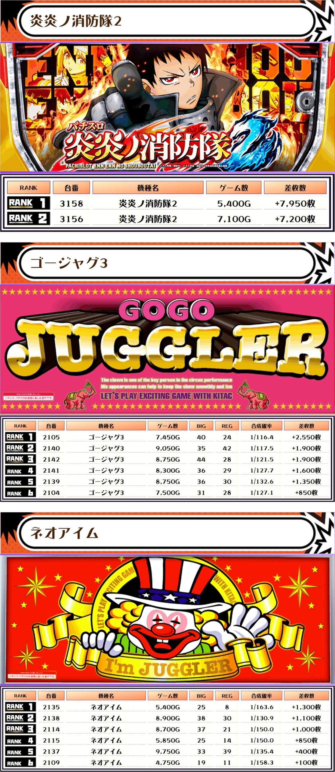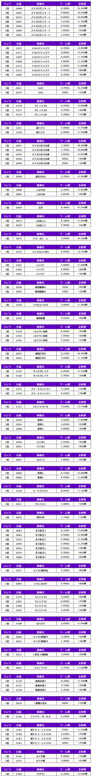 今回もランキングの大半は5000枚以上で埋め尽くされ、万枚オーバーが3台も出現🔥🔥🔥くぅ~、ベリーナイスですねぇ~👍