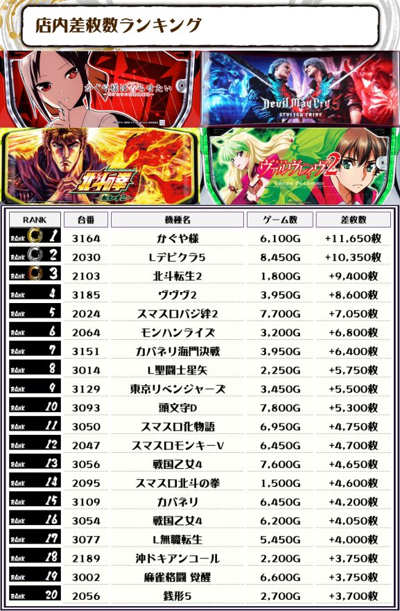 差枚ランキングでTOPに輝いたのは【かぐや様・3164番台】で+11,650枚‼️