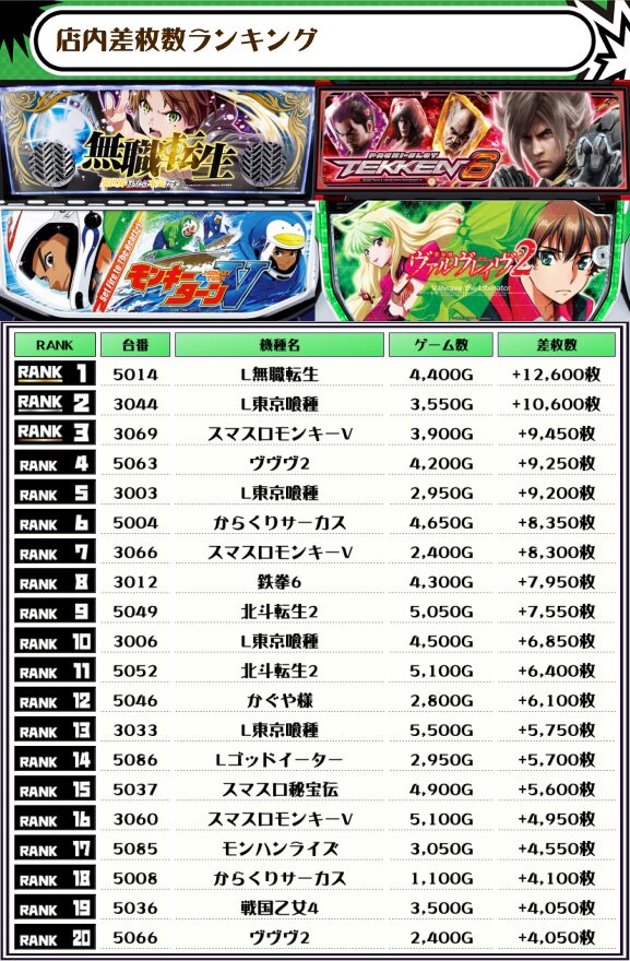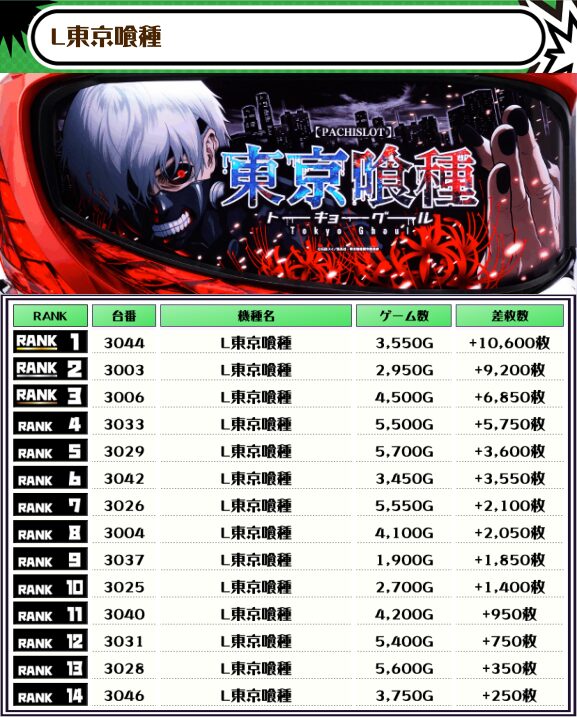 2位には【L東京喰種・3044番台】の+10,600枚、そして3位には【スマスロモンキーV・3069番台】の+9,450枚がランクインしていますっ✨