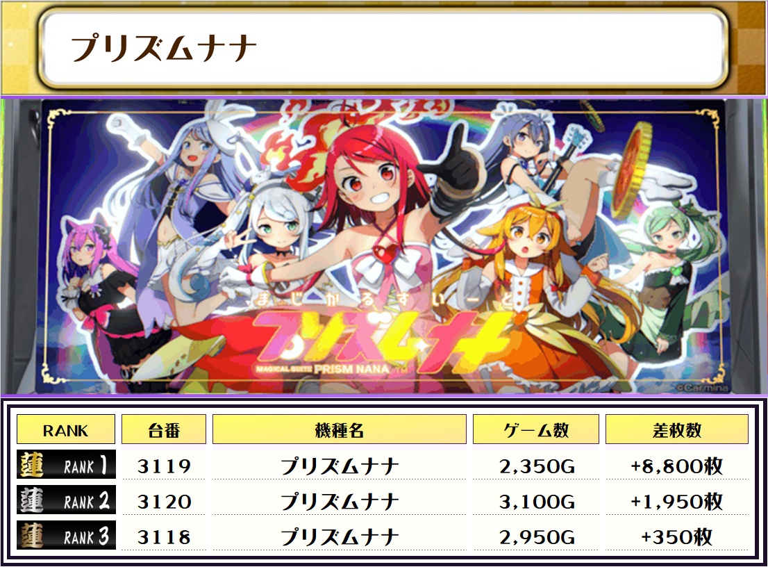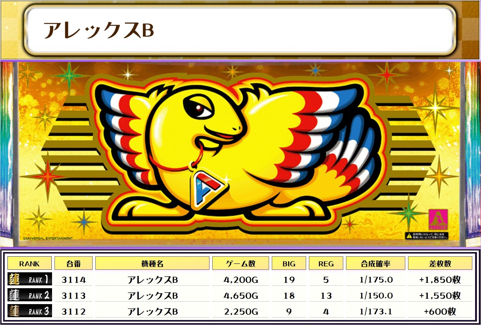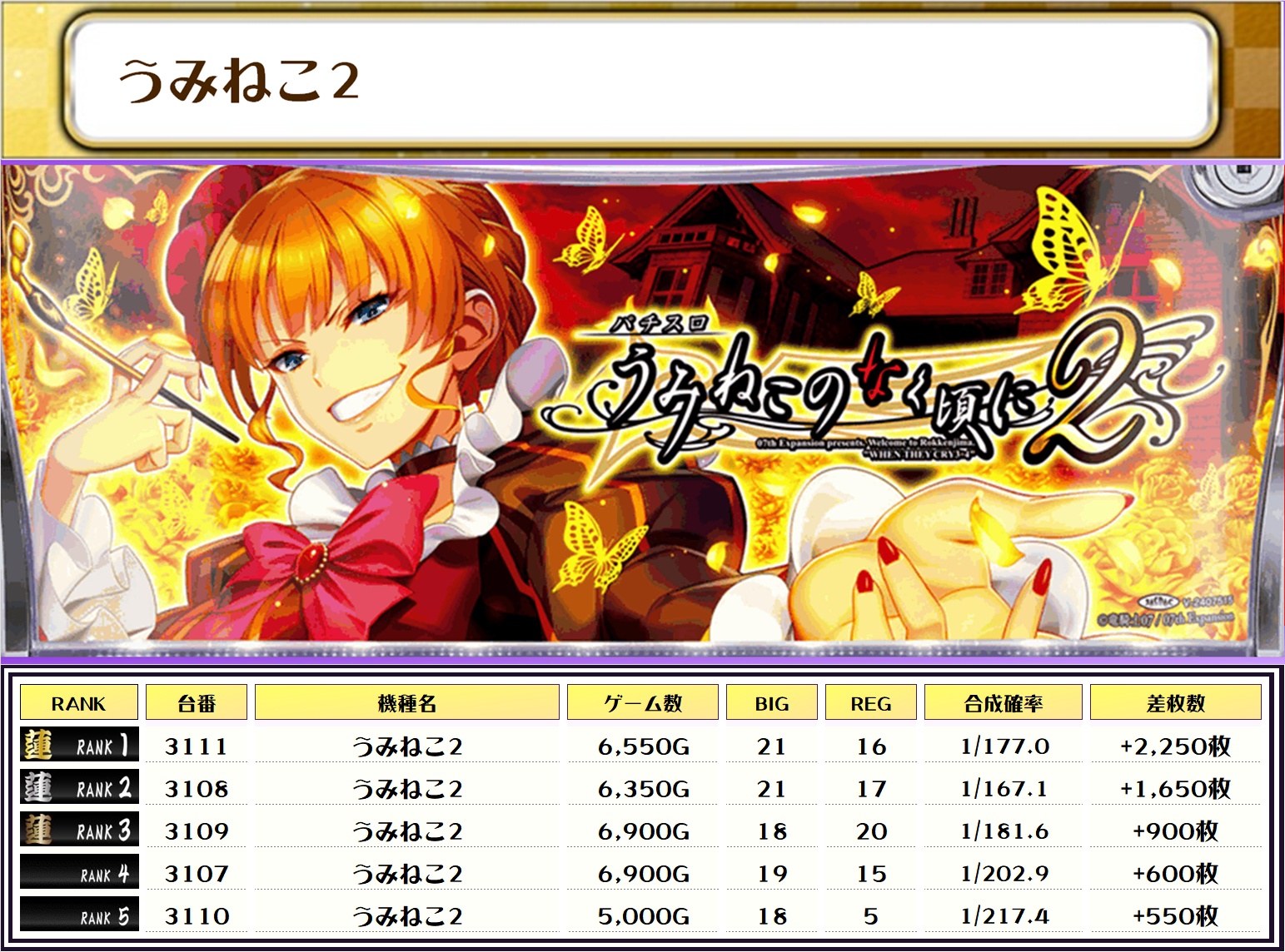 ちなみに、うみねこ2・アレックス・プリズムナナはどれも全台が差枚数でプラスを達成‼️すばらしいですね🎉🎉🎉