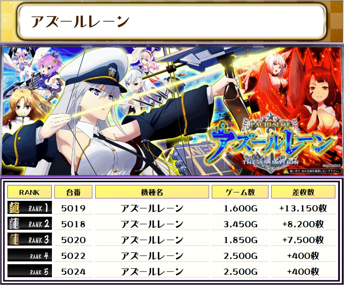 全体差枚のトップは【アズールレーン・5019番台】で+13,150枚っ❗️