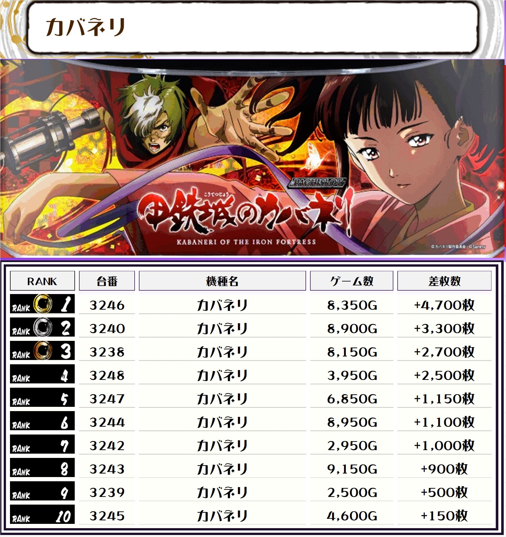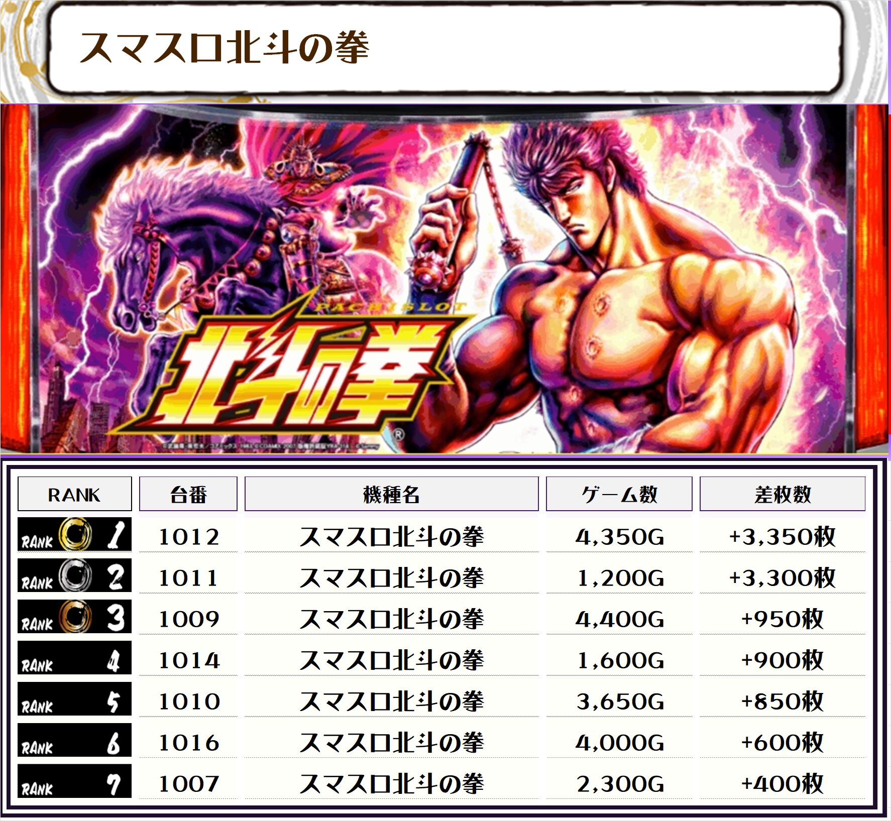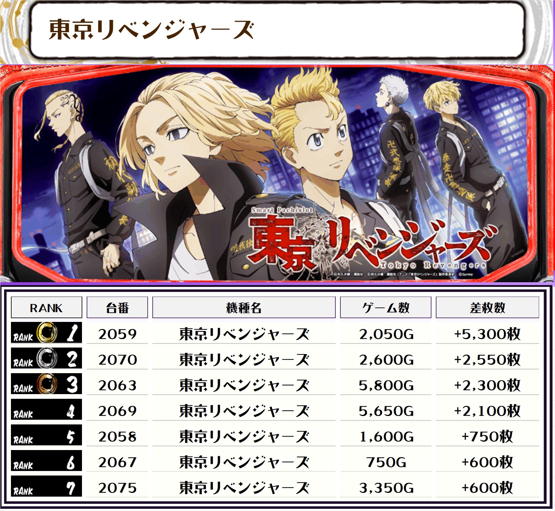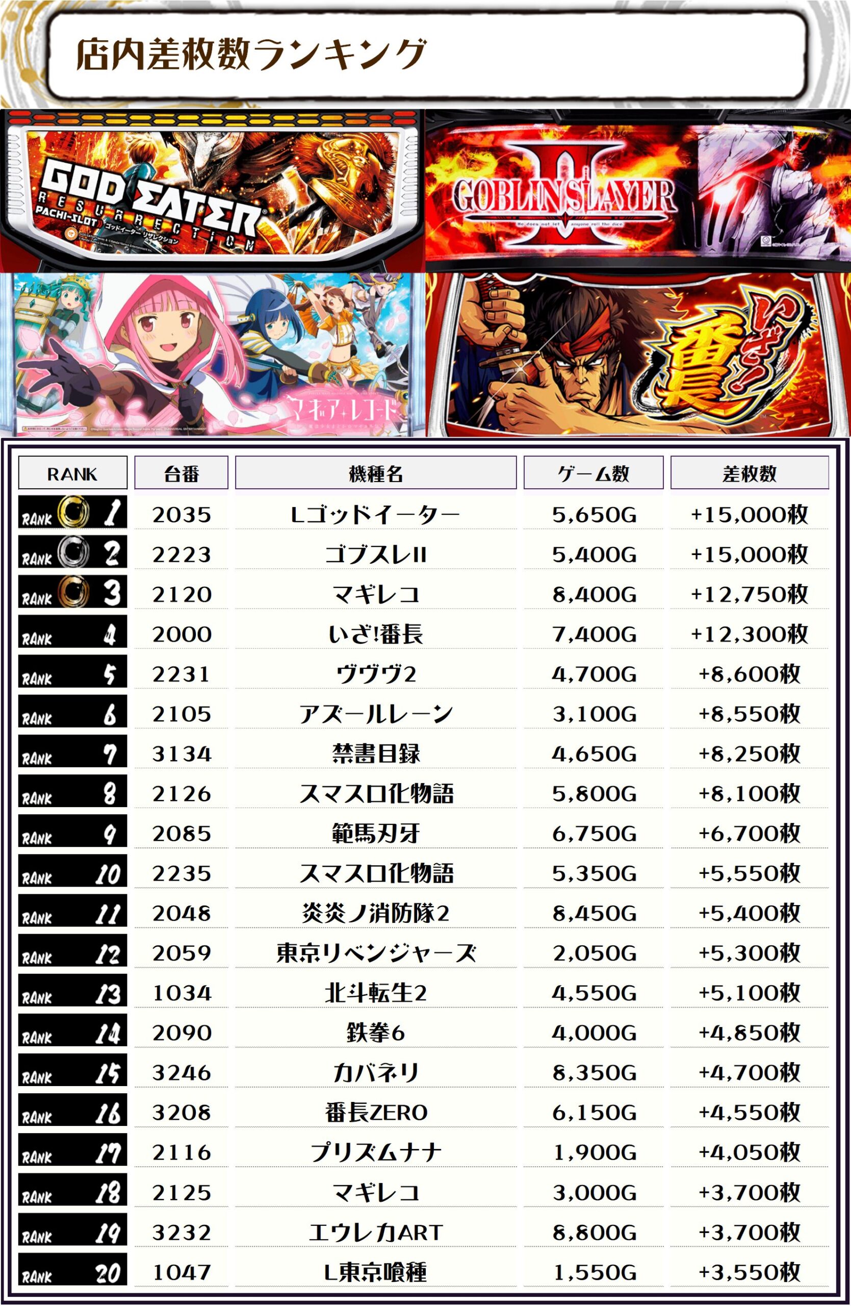 今回のランキングはお見事、万枚オーバー4台、13位までが5000枚オーバーとなりました📷📝