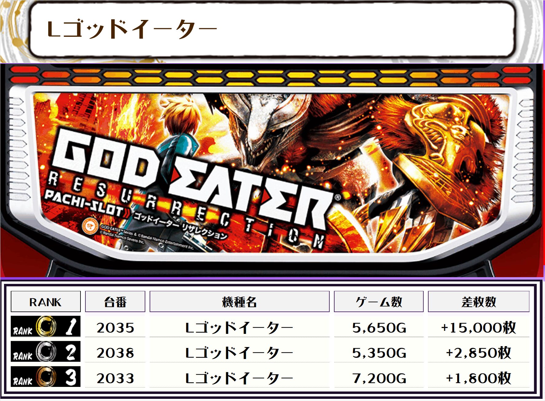 この日、全体の差枚トップに輝いたのは【Lゴッドイーター・2035番台】の+15,000枚‼️