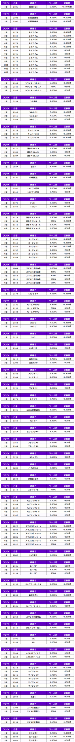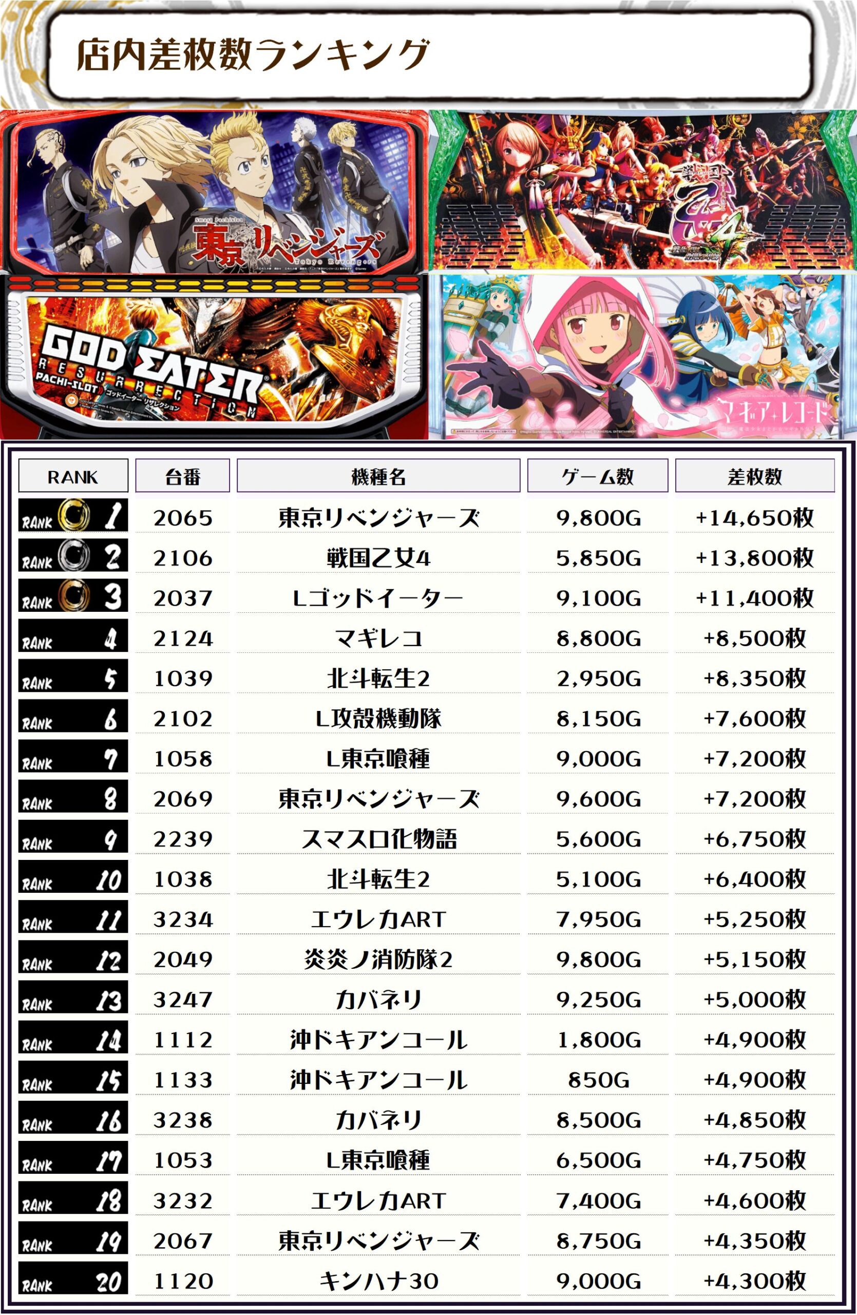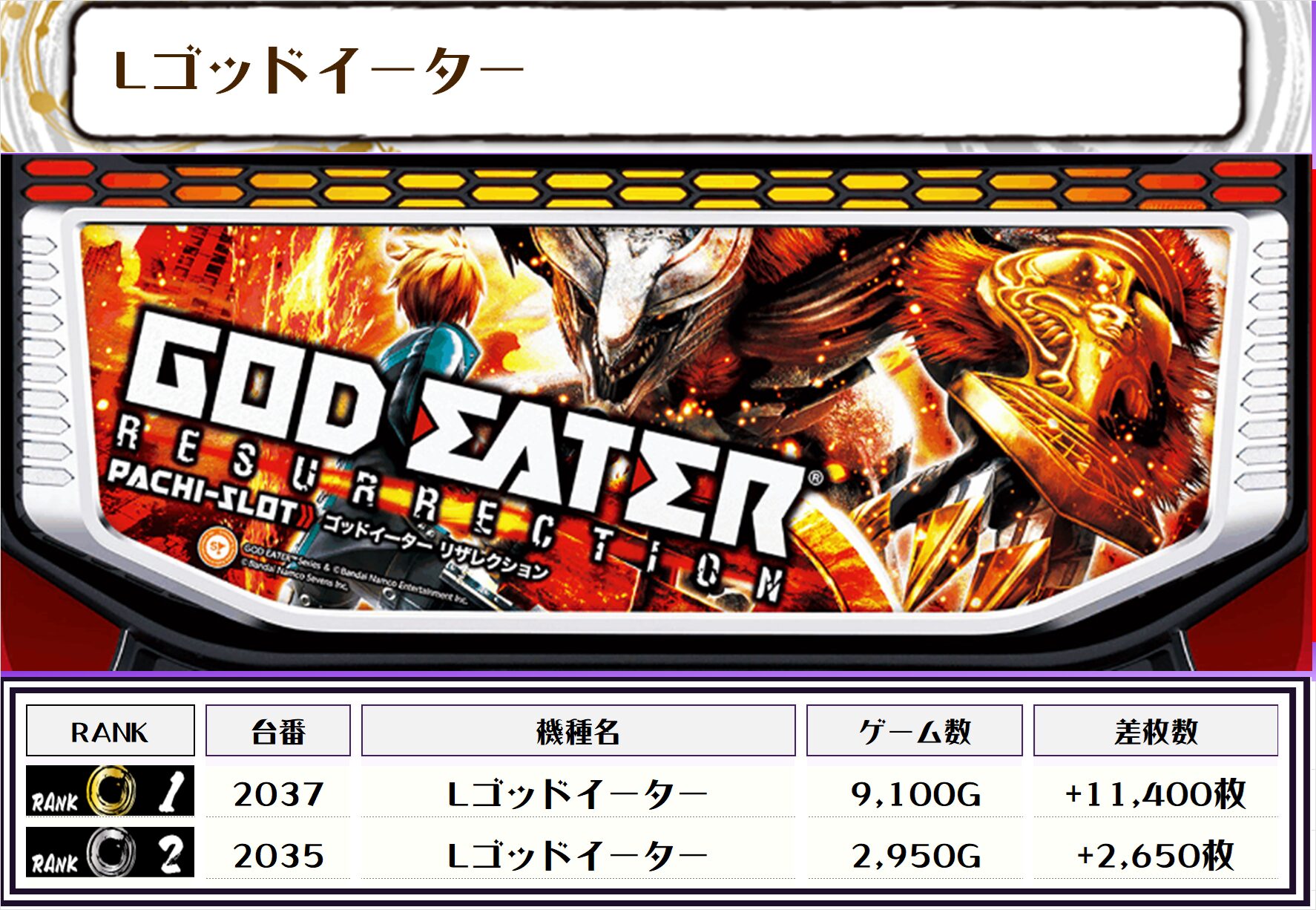 2位には【戦国乙女4・2106番台】の+13,800枚、3位には【Lゴッドイーター・2037番台】の+11,400枚がランクインっ🏆🏆🏆🏆