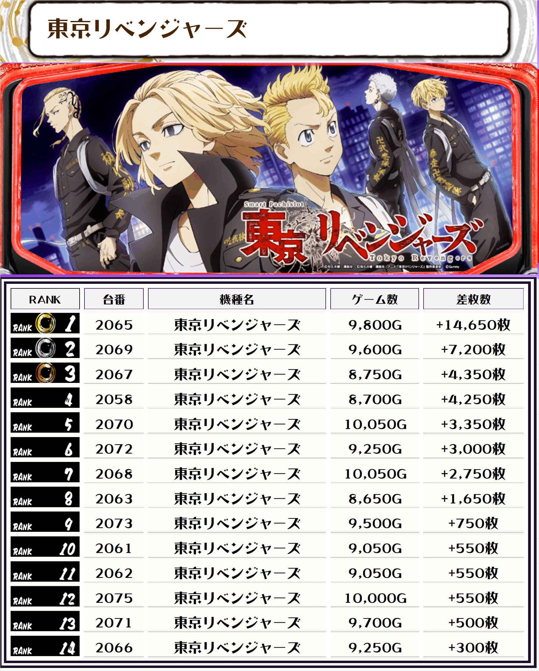 この日、全体の差枚トップに輝いたのは【東京リベンジャーズ・2065番台】の+14,650枚‼️