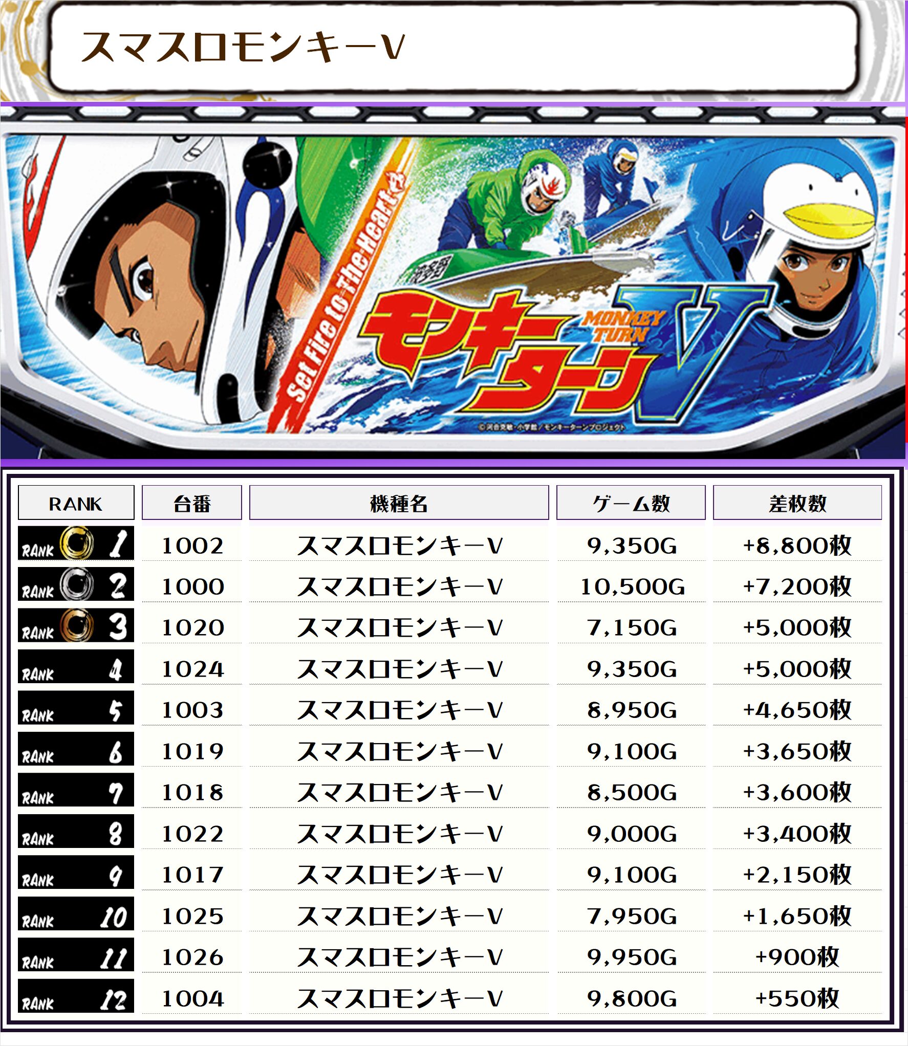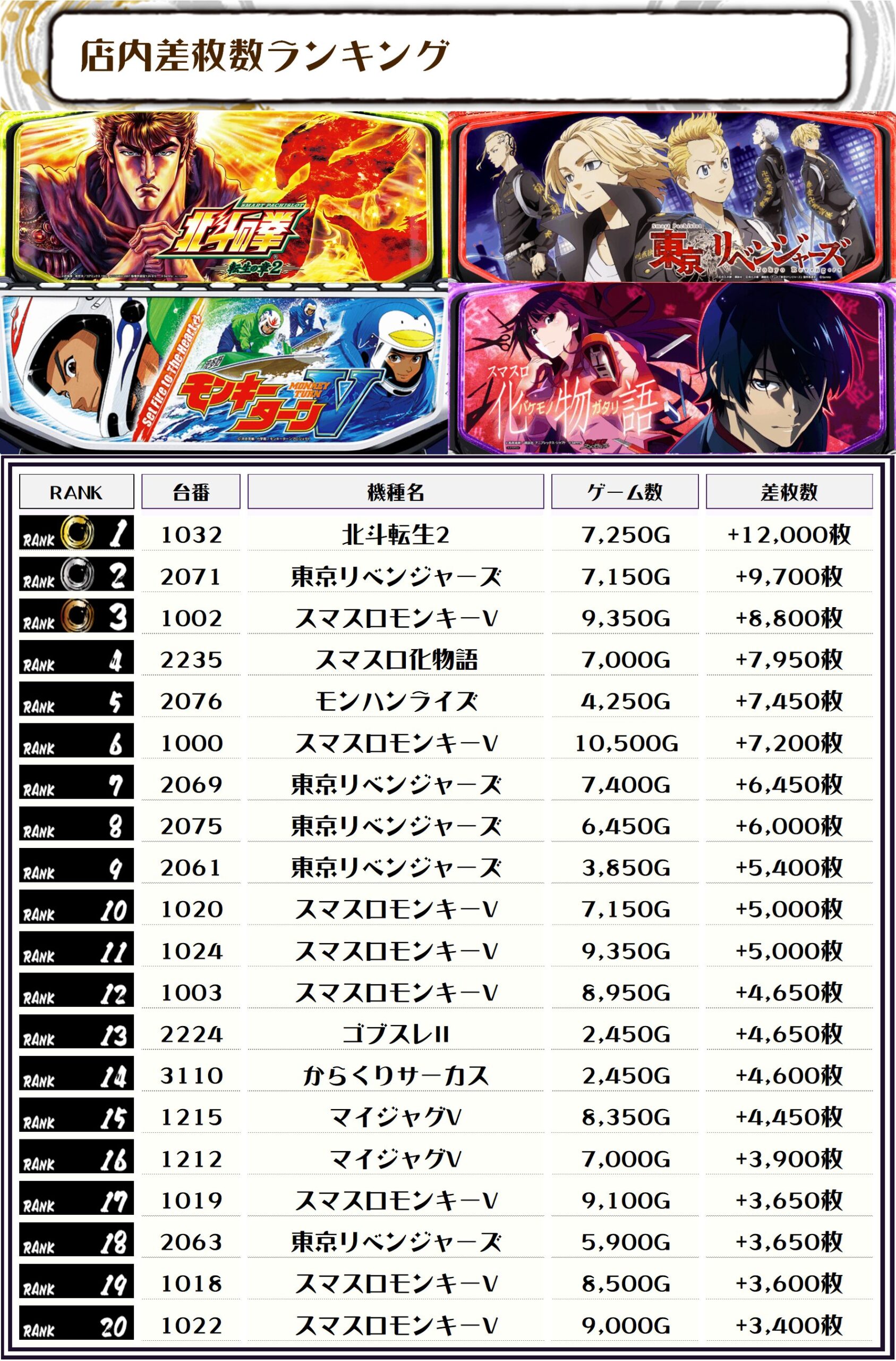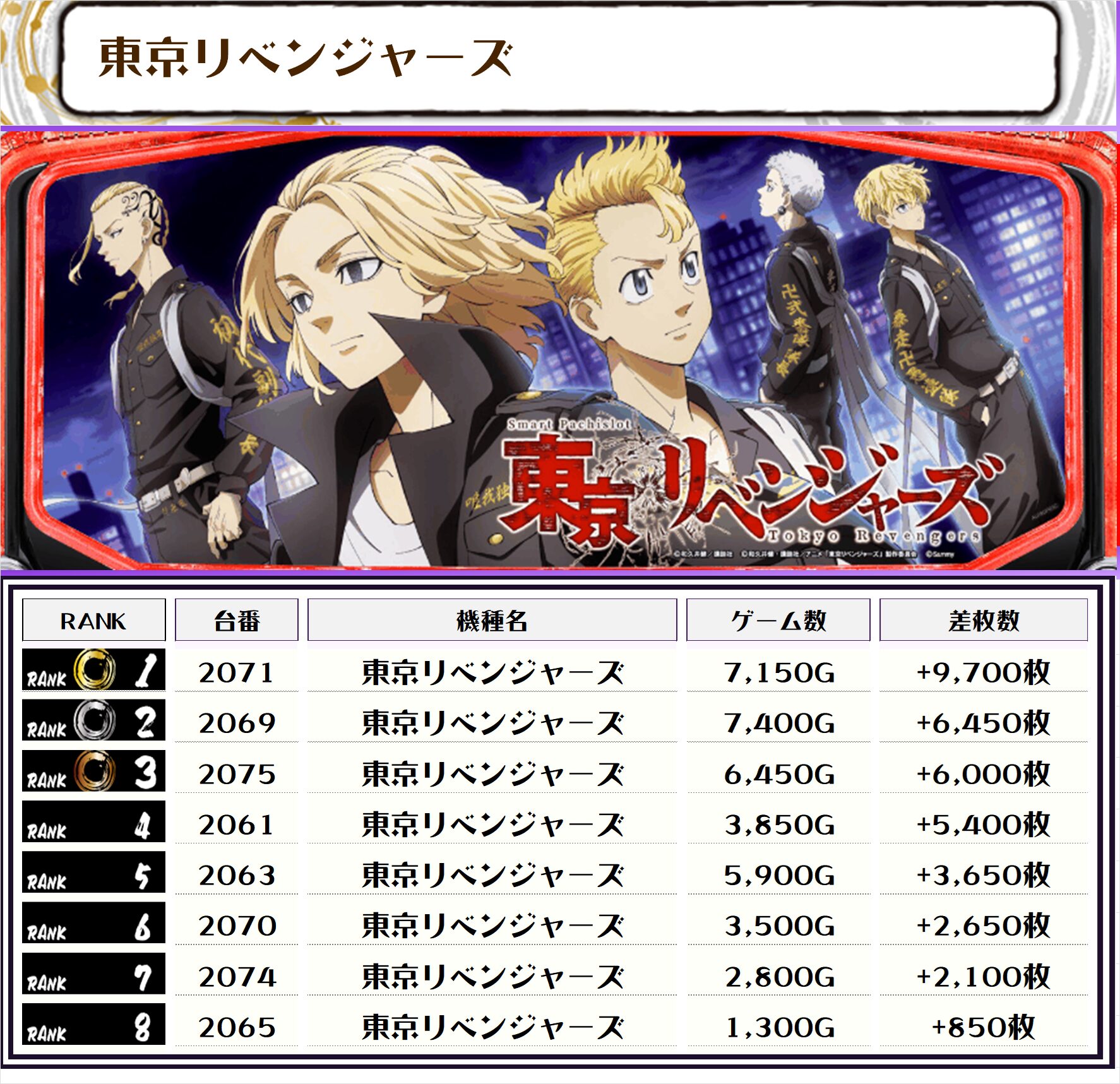 2位には【東京リベンジャーズ・2071番台】の+9,700枚、3位には【スマスロモンキーV・1002番台】の+8,800枚がランクインっ🏆🏆🏆🏆