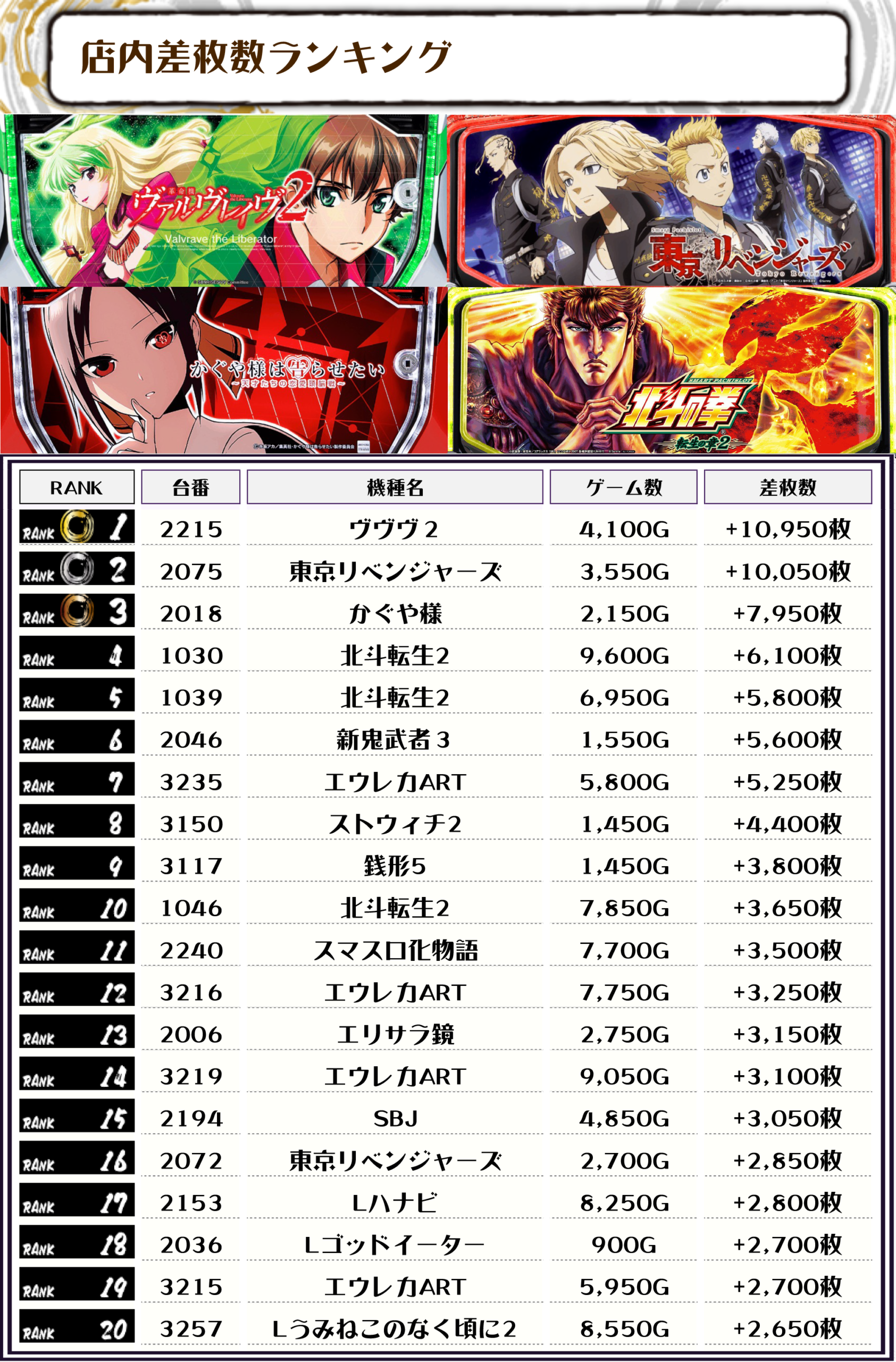 それでは早速【機種別差枚ランキング】をチェックしていきましょう🙆‍♀️