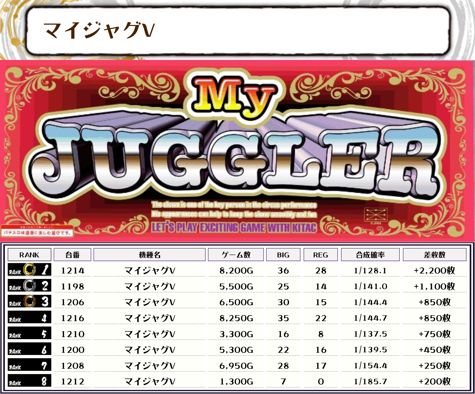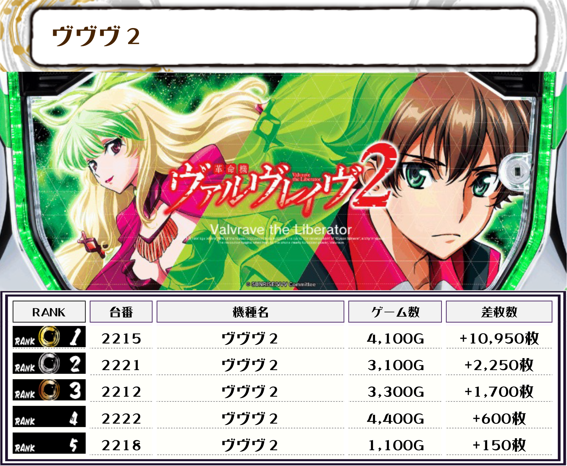 この日、全体の差枚トップに輝いたのは【ヴヴヴ2・2215番台】の+10,950枚‼️