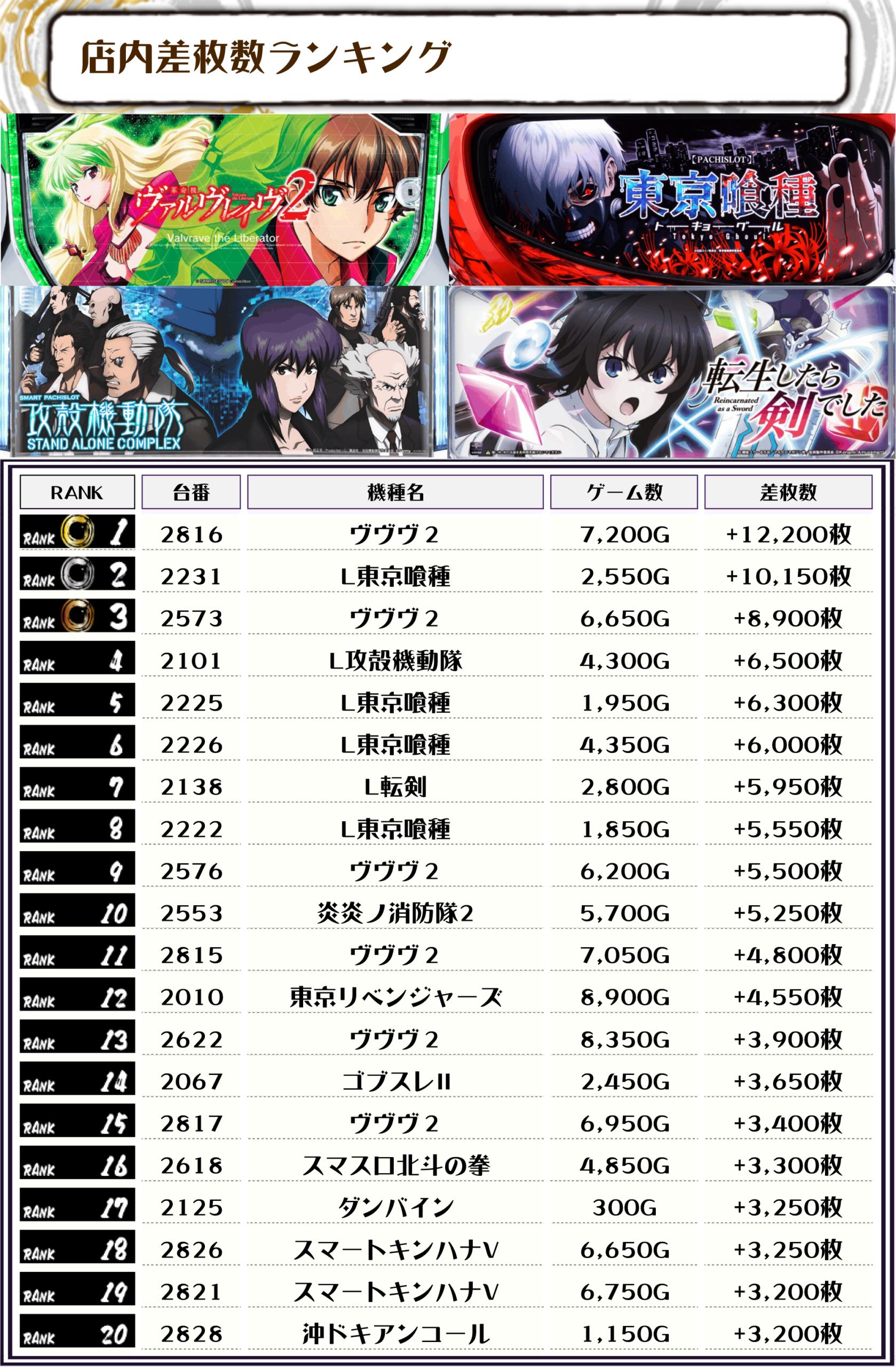 2位には【L東京喰種・2231番台】の+10,150枚、3位には【ヴヴヴ2・2573番台】の+8,900枚がランクインっ🏆🏆🏆🏆