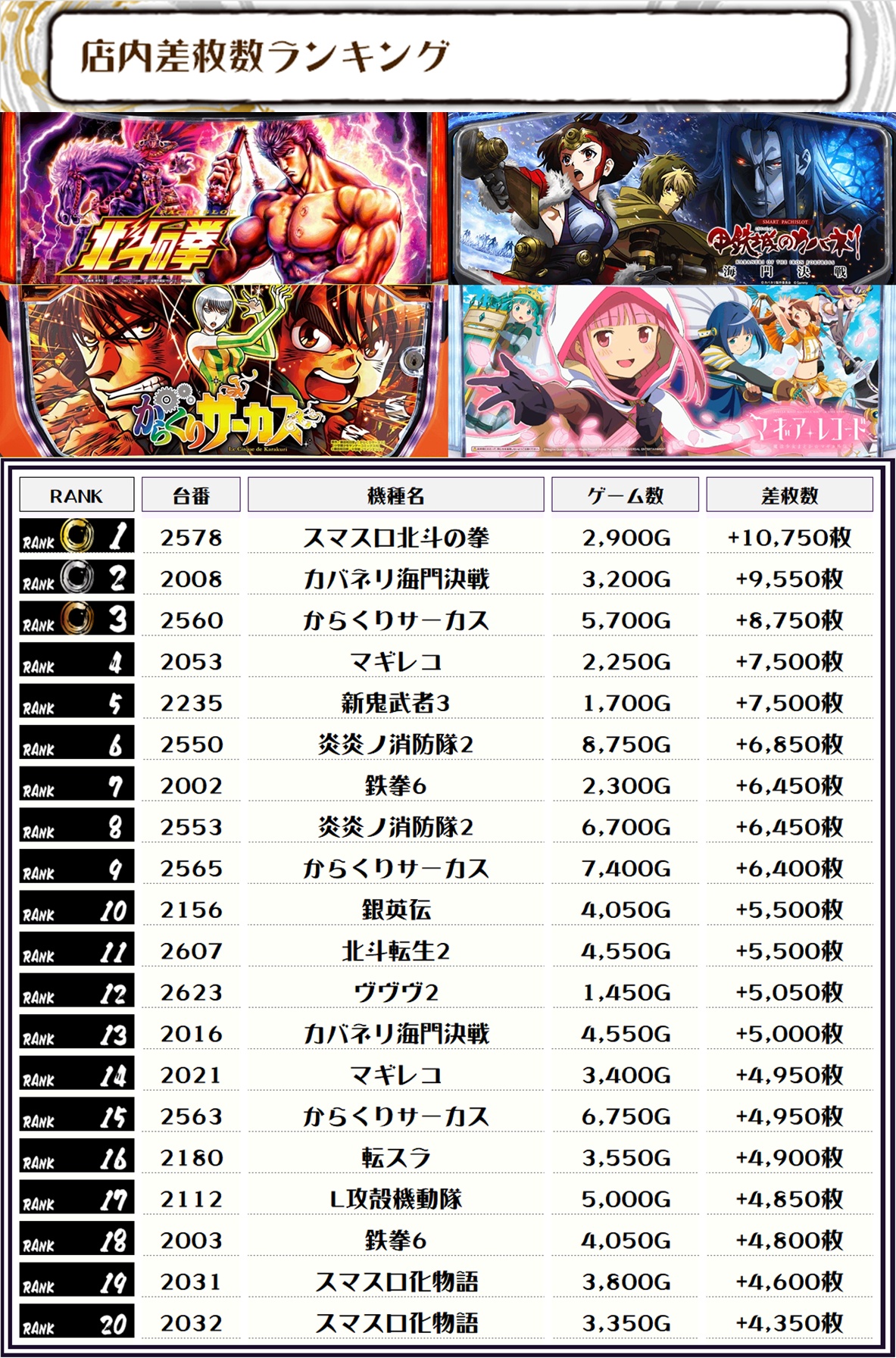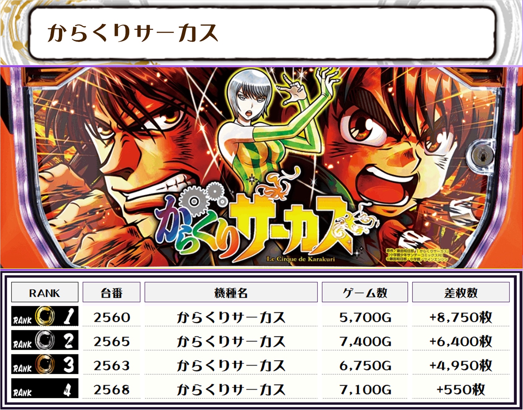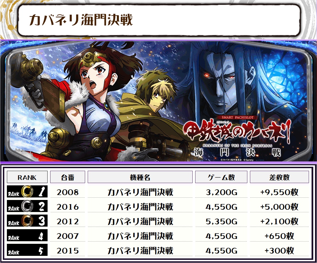 2位には【カバネリ海門決戦・2008番台】の+9,550枚、3位には【からくりサーカス・2560番台】の+8,750枚がランクインっ🏆🏆🏆🏆