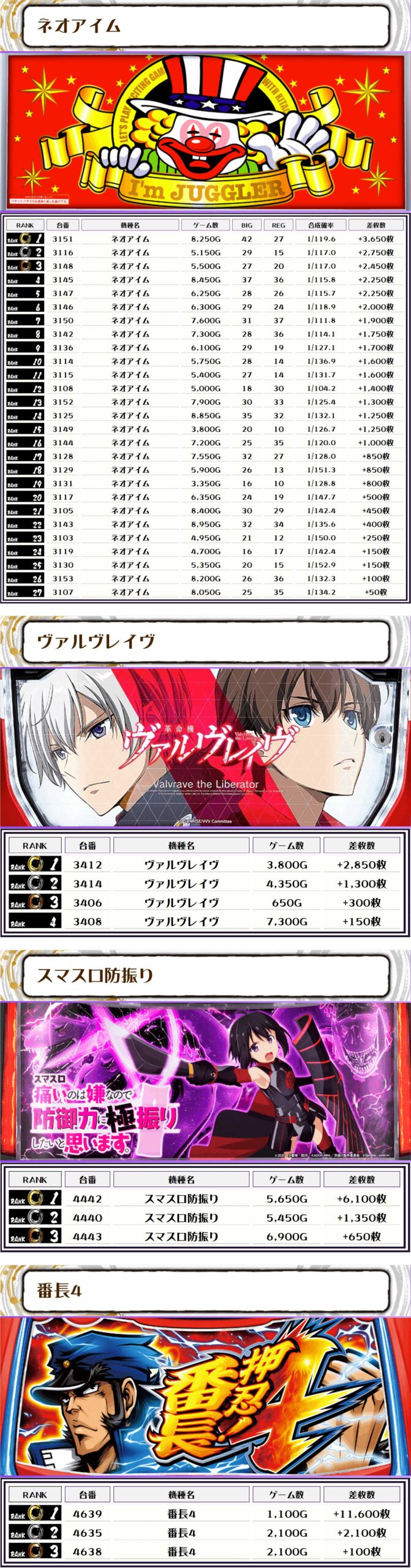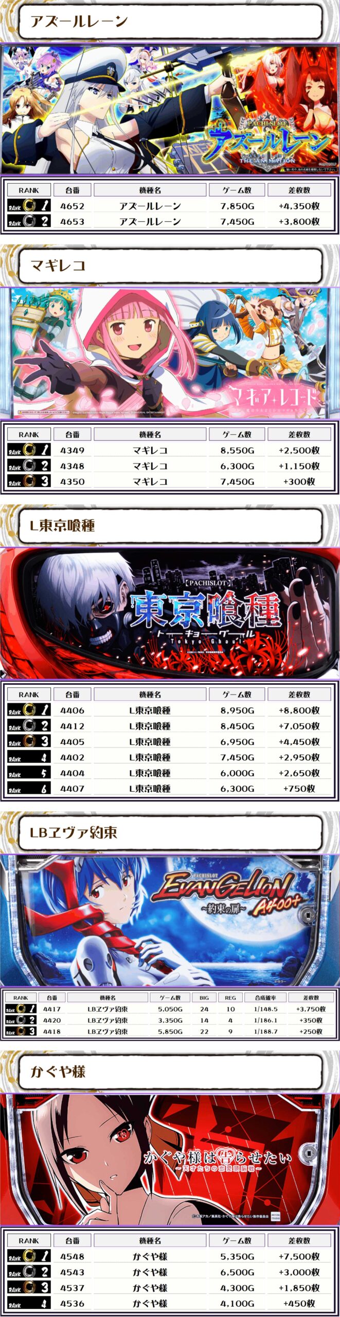 また、ヴァルヴレイヴ・スマスロ防振り・番長4・アズールレーンは全台系と思しき挙動、マギレコ・L東京喰種・LBヱヴァ約束・アズールレーンには3台並びの塊らしきエリアを確認できましたよ🔎