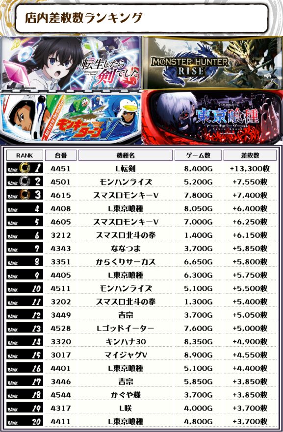 2位には【モンハンライズ・4501番台】の+7,550枚、そして3位には【スマスロモンキーV・4615番台】の+7,400枚がランクインっ🏆🏆🏆