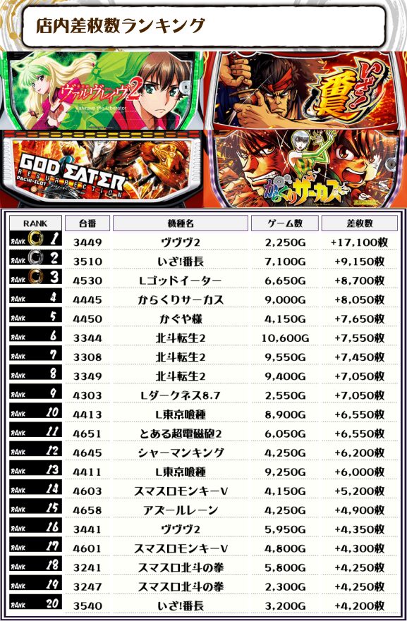 2位には【いざ!番長・3510番台】の+9,150枚、そして3位には【Lゴッドイーター・4530番台】の+8,700枚がランクインっ🏆🏆🏆🏆