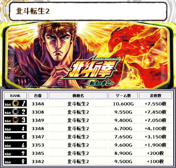 今回は人気どころの機種がしっかりと稼働しており、優秀台も出ていましたね🔥 新台の北斗転生2もランクインが目立ちます👀