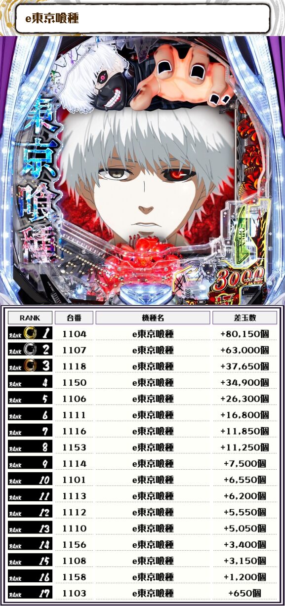 続く2位には【e東京喰種・1107番台】の+63,000発、そして3位には【e東京喰種・1118番台】の+37,650発がランクインしたぜっ💪