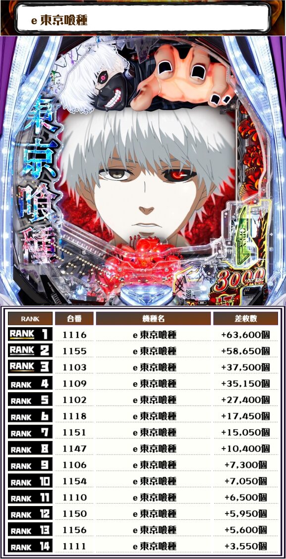 続く2位には【e東京喰種・1155番台】の+58,650発、そして3位には【e東京喰種・1103番台】の+37,500発がランクインしたぜっ💪