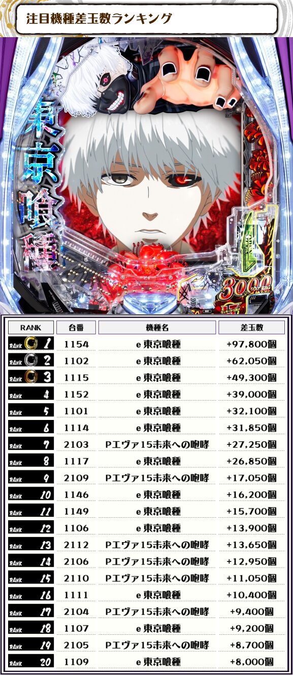 続く2位にも【e東京喰種・1102番台】の+62,050発、そして3位にも【e東京喰種・1115番台】の+49,300発がランクインしたぜっ💪