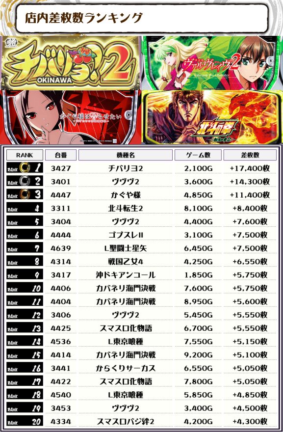 2位には【ヴヴヴ2・3401番台】の+14,300枚、そして3位には【かぐや様・4447番台】の+11,400枚がランクインっ🏆🏆🏆🏆