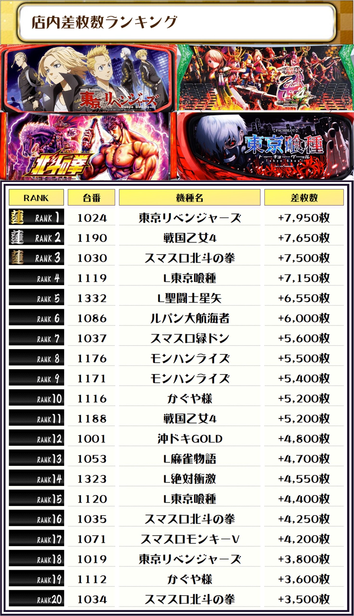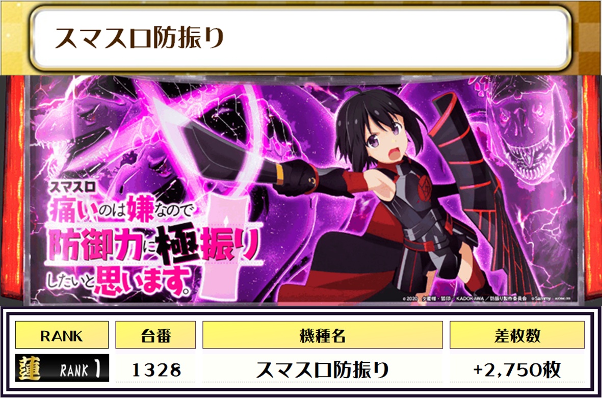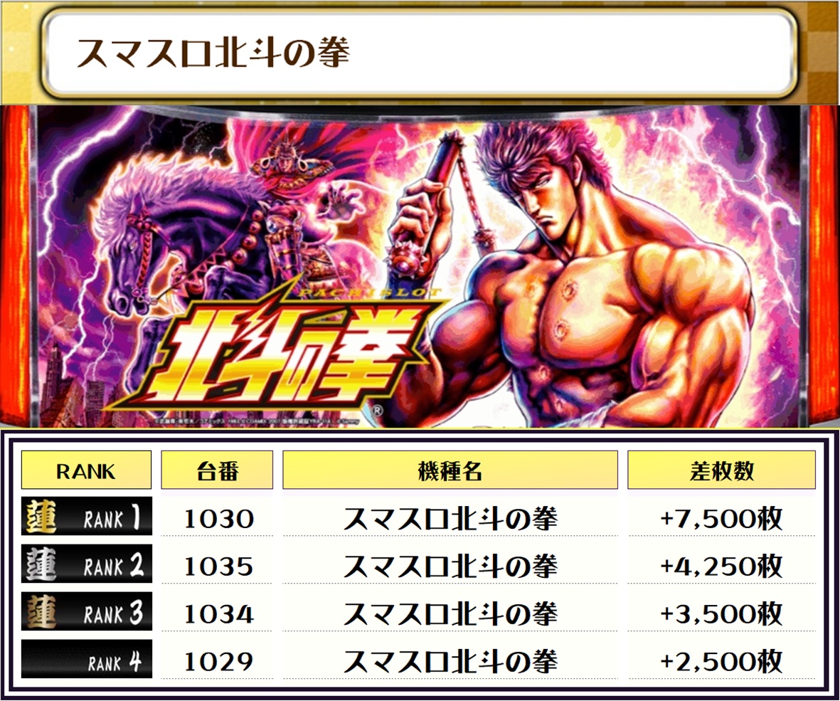 2位には【戦国乙女4・1190番台】の+7,650枚、3位には【スマスロ北斗の拳・1030番台】の+7,500枚がランクインしましたーっ🏆