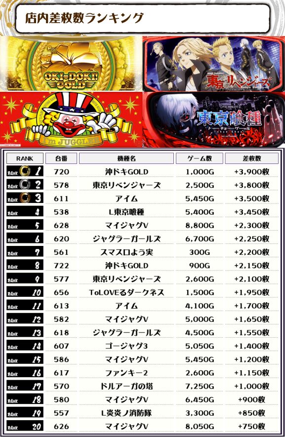続く2位には【東京リベンジャーズ・578番台】の+3,800枚、そして3位にはアイム・611番台】の+3,500枚がランクインですっ🏆🏆🏆🏆
