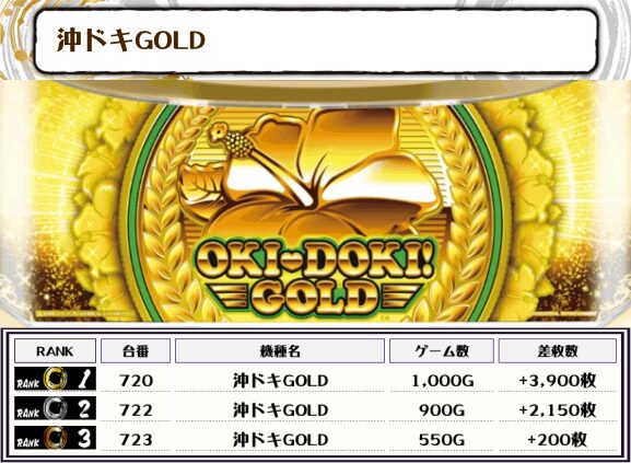 この日、全体の差枚トップに輝いたのは【沖ドキGOLD・720番台】で+3,900枚‼️