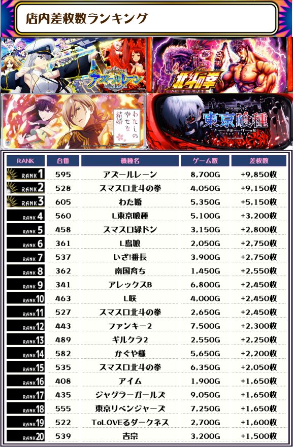 続く2位には【スマスロ北斗の拳・528番台】の+9,150枚、そして3位には【わた婚・605番台】の+5,150枚がランクインしていますっ🌈✨