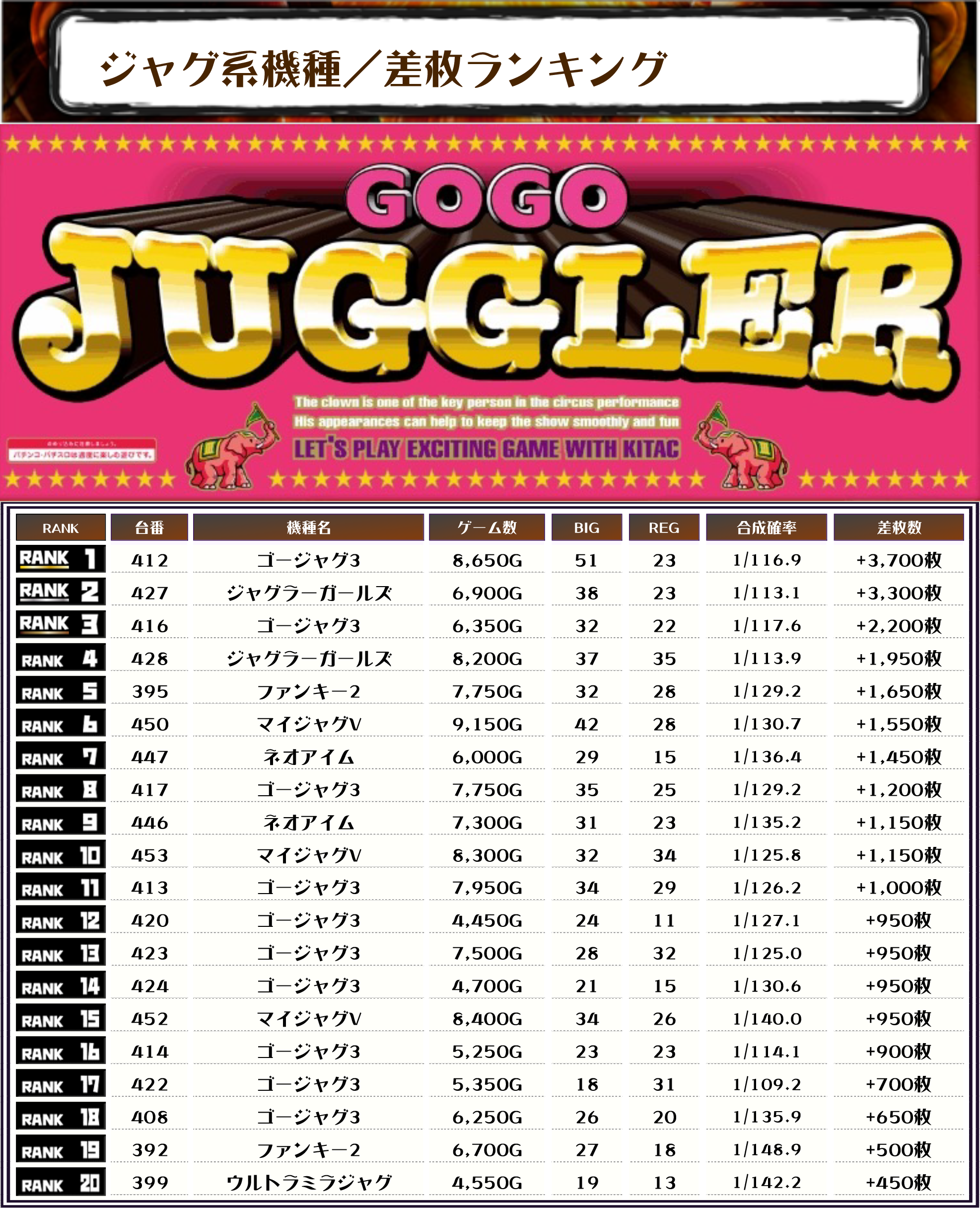 また2位は【ジャグラーガールズ・427番台】の+3,300枚、3位には【ゴージャグ3・416番台】の+2,200枚がランクインっ