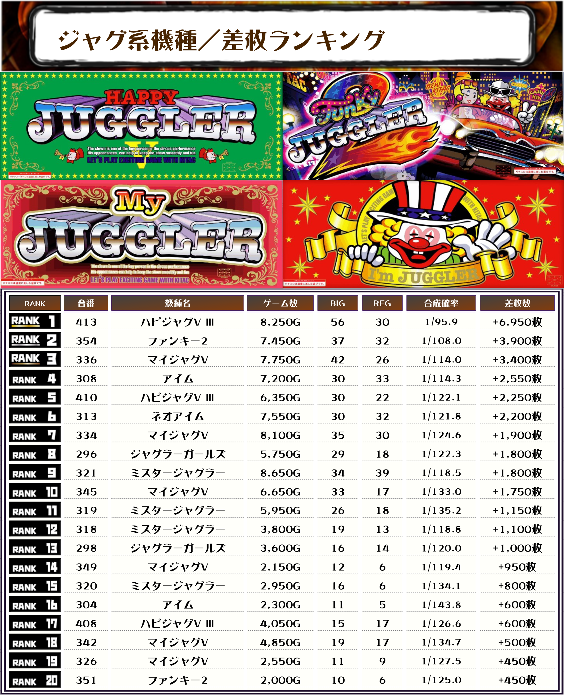 また、2位には【ファンキー2・354番台】の+3,900枚、3位には【マイジャグV・336番台】の+3,400枚がランクイン!