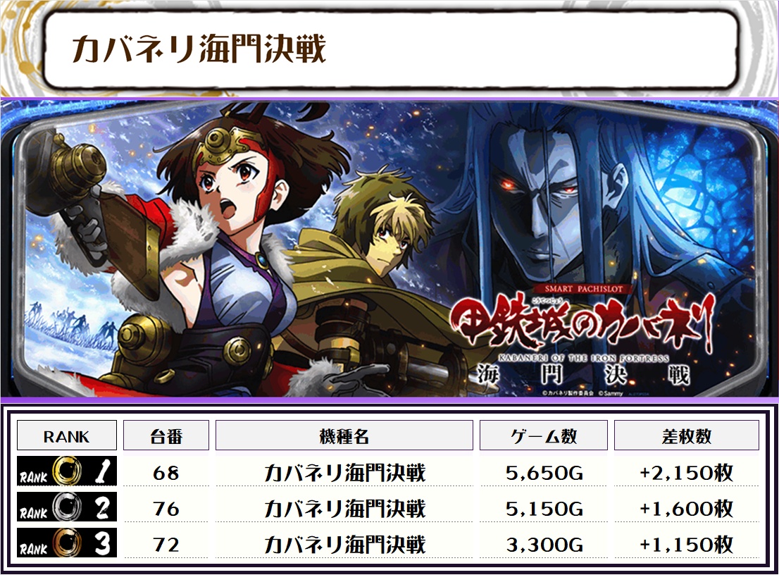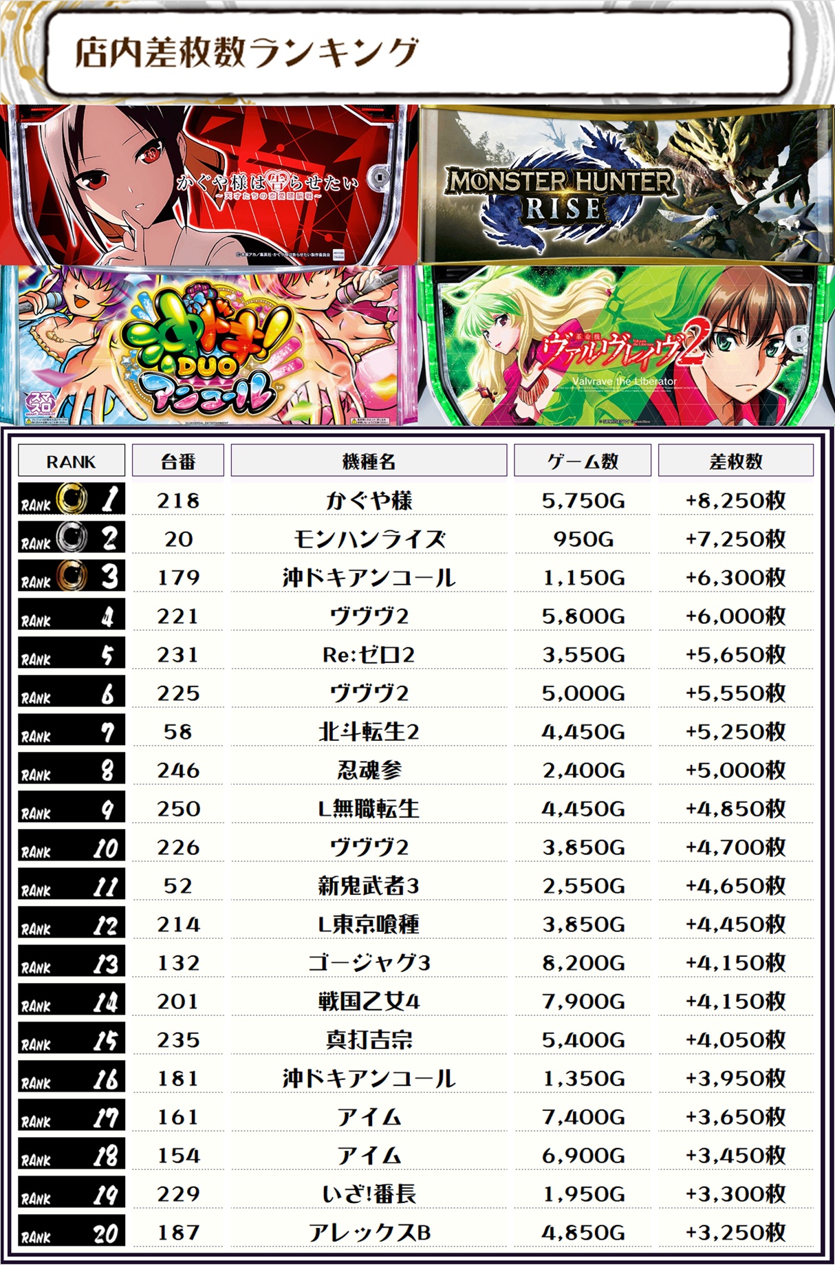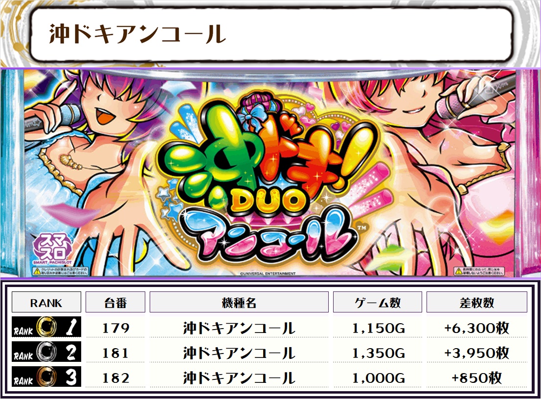 2位には【モンハンライズ・20番台】の+7,250枚、そして3位には沖ドキアンコール・179番台】の+6,300枚がランクインっ🏆🏆🏆🏆