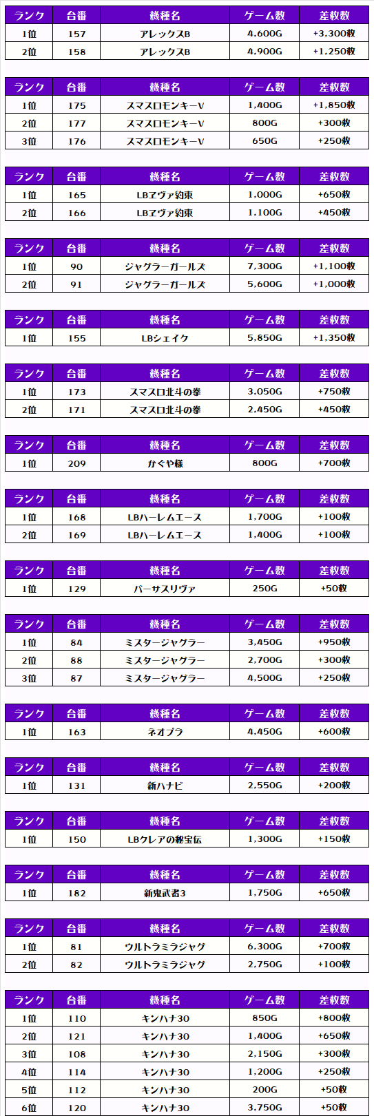 この日、全体の差枚トップに輝いたのは【アレックスB・157番台】で+3,300枚‼️